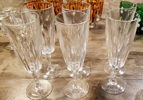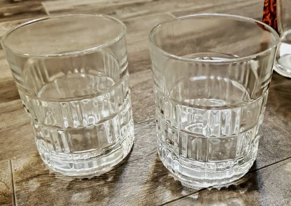 Libby Amber glasses in a tulip shape – 4 Lrg 2 Sm. - $20 (lower right) Six Duralex Picardie tumbler glasses – $20 (middle right) Pair of French heavy-bottomed, textured whiskey glasses – $15 (top...