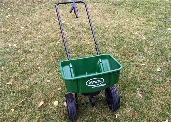 Scotts “Speedy Green 1000” broadcast spreader for sale. Hold up to 1000 sq. m. of lawn fertilizer. Used a couple of times in the past ~ in real good condition.